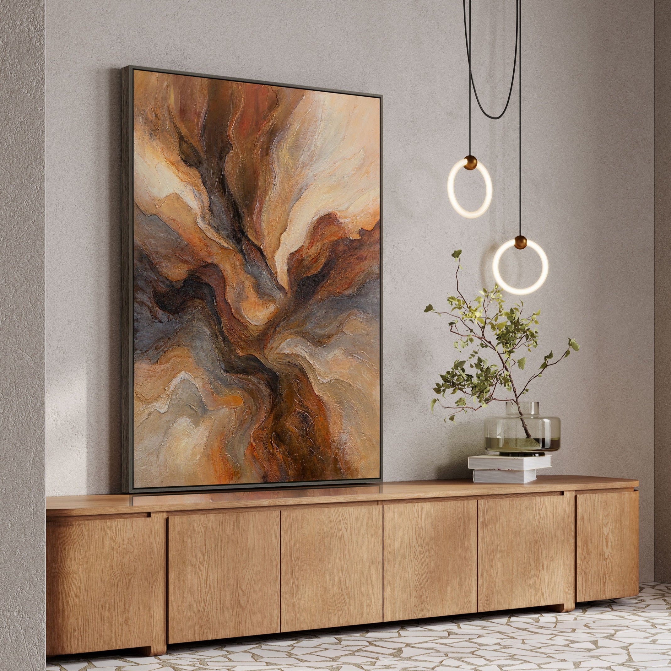 Dieses Gemälde wird zu einem auffälligen Akzent in einem modernen Interieur und verleiht dem Raum Energie und Charakter. „Blitz der Ewigkeit” unterstreicht die Individualität des Raumes und schafft eine Atmosphäre von Kraft, Wärme und Dynamik.