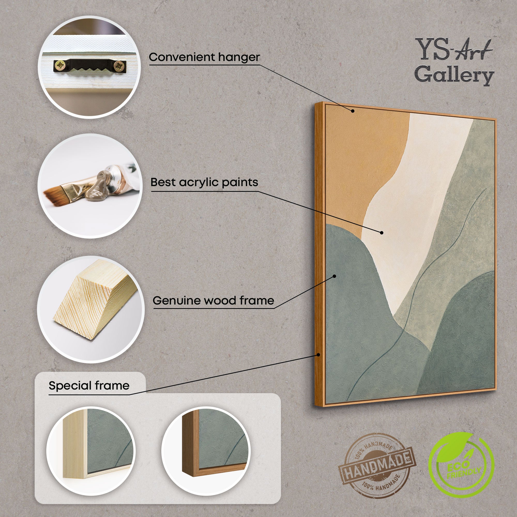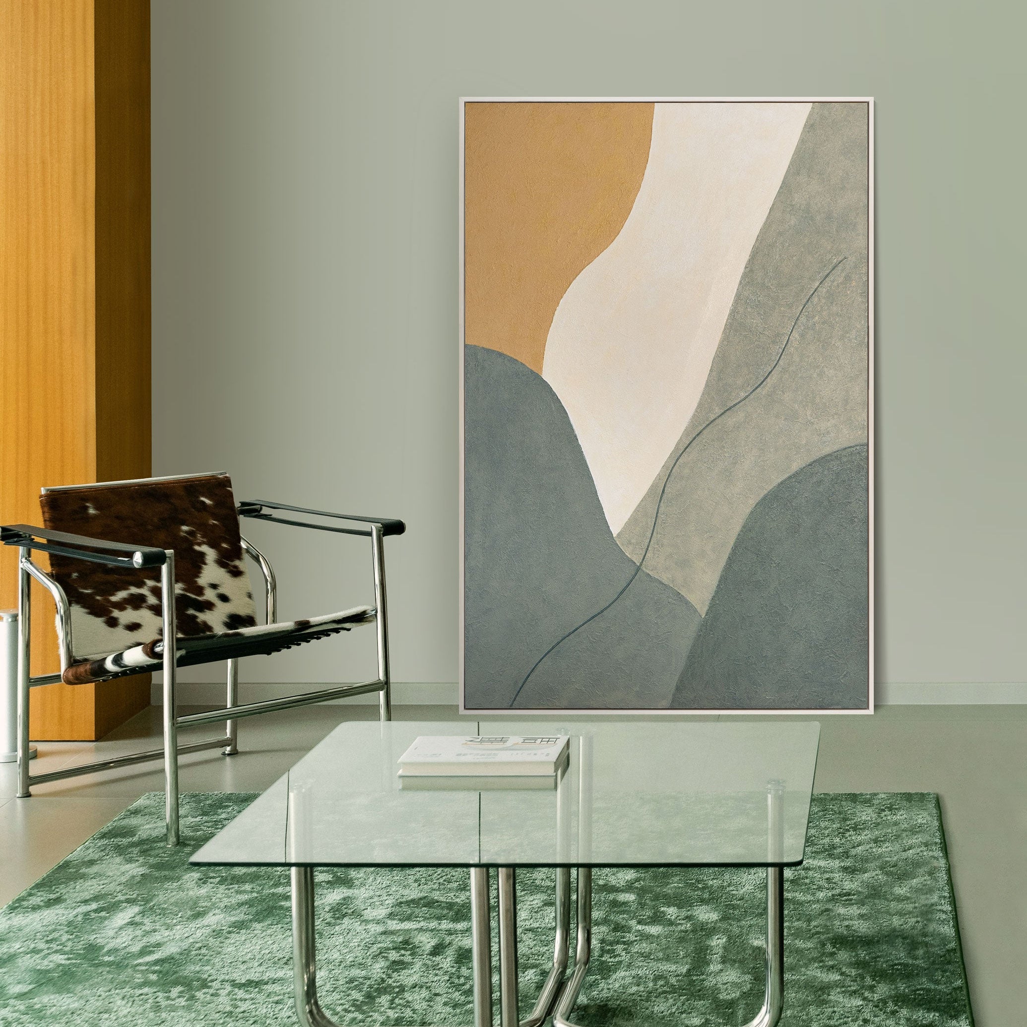 „Die ewige Linie“ ist eine ruhige und ausgewogene Komposition, in der die sanften Kurven der Formen den Rhythmus der Natur widerspiegeln. Die Kombination aus grünlichen, ockerfarbenen und cremefarbenen Tönen vermittelt ein Gefühl von Tiefe und ununterbrochener Bewegung. Die Linie, die sich sanft durch das Bild zieht, symbolisiert die Harmonie zwischen Kraft und Leichtigkeit, zwischen Erde und Himmel.