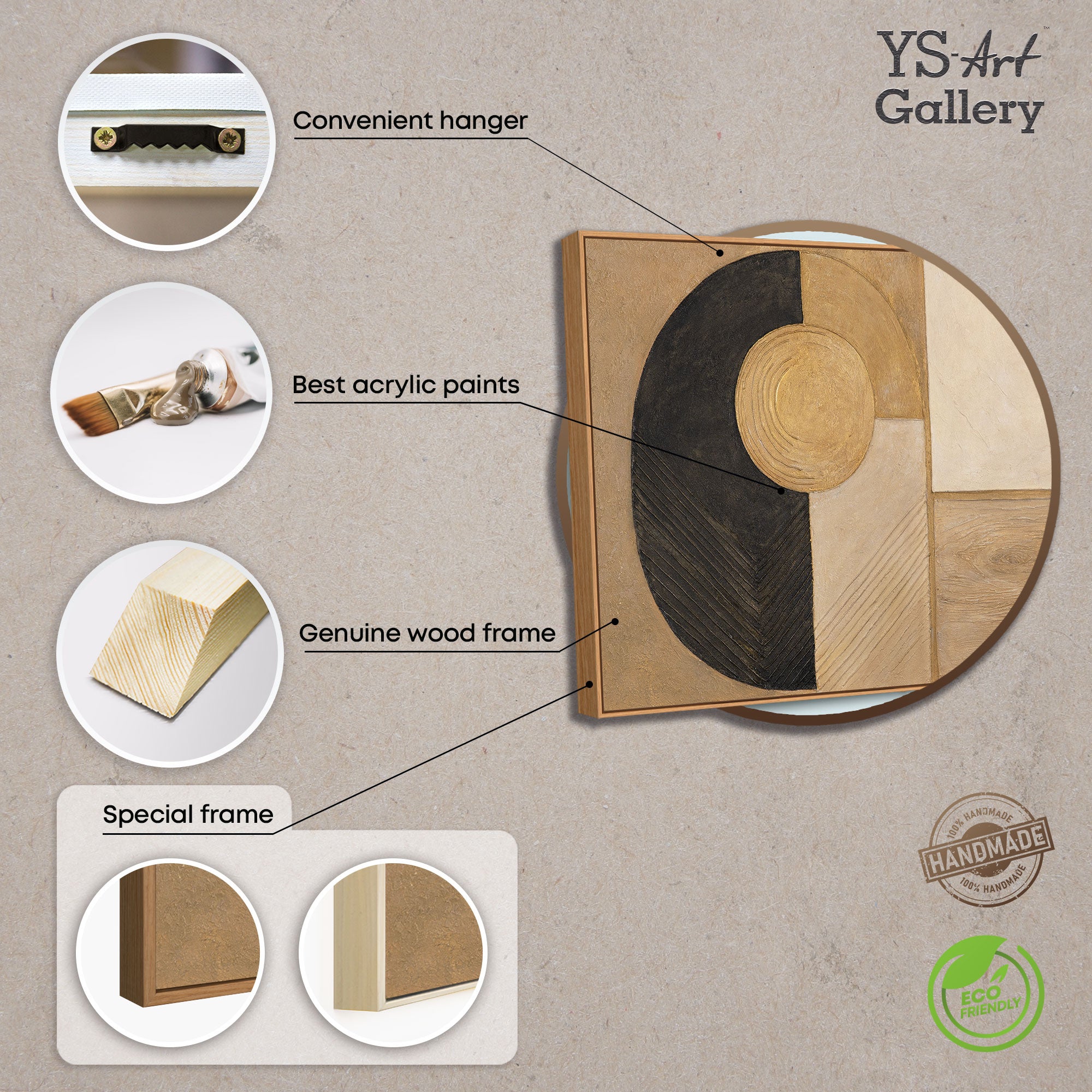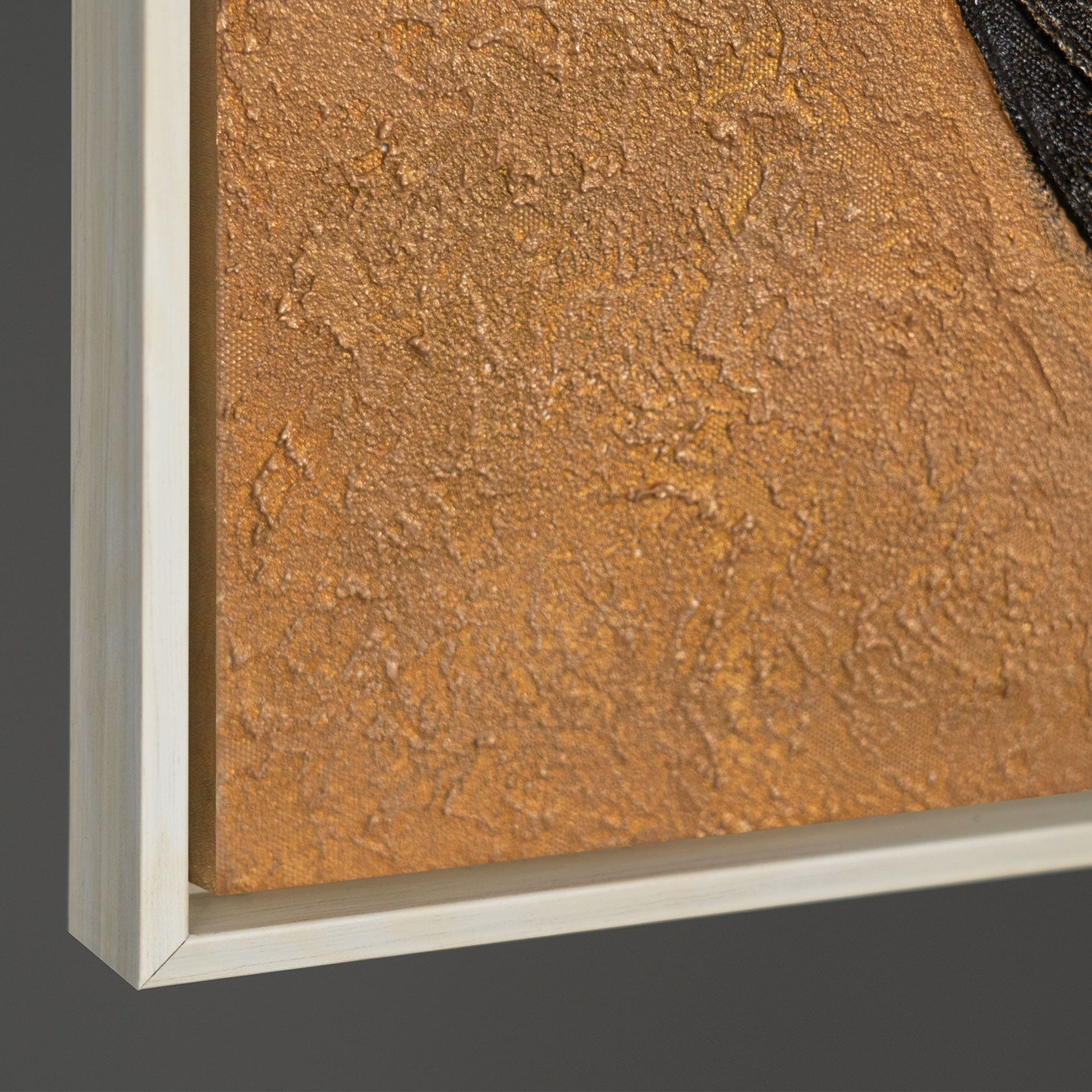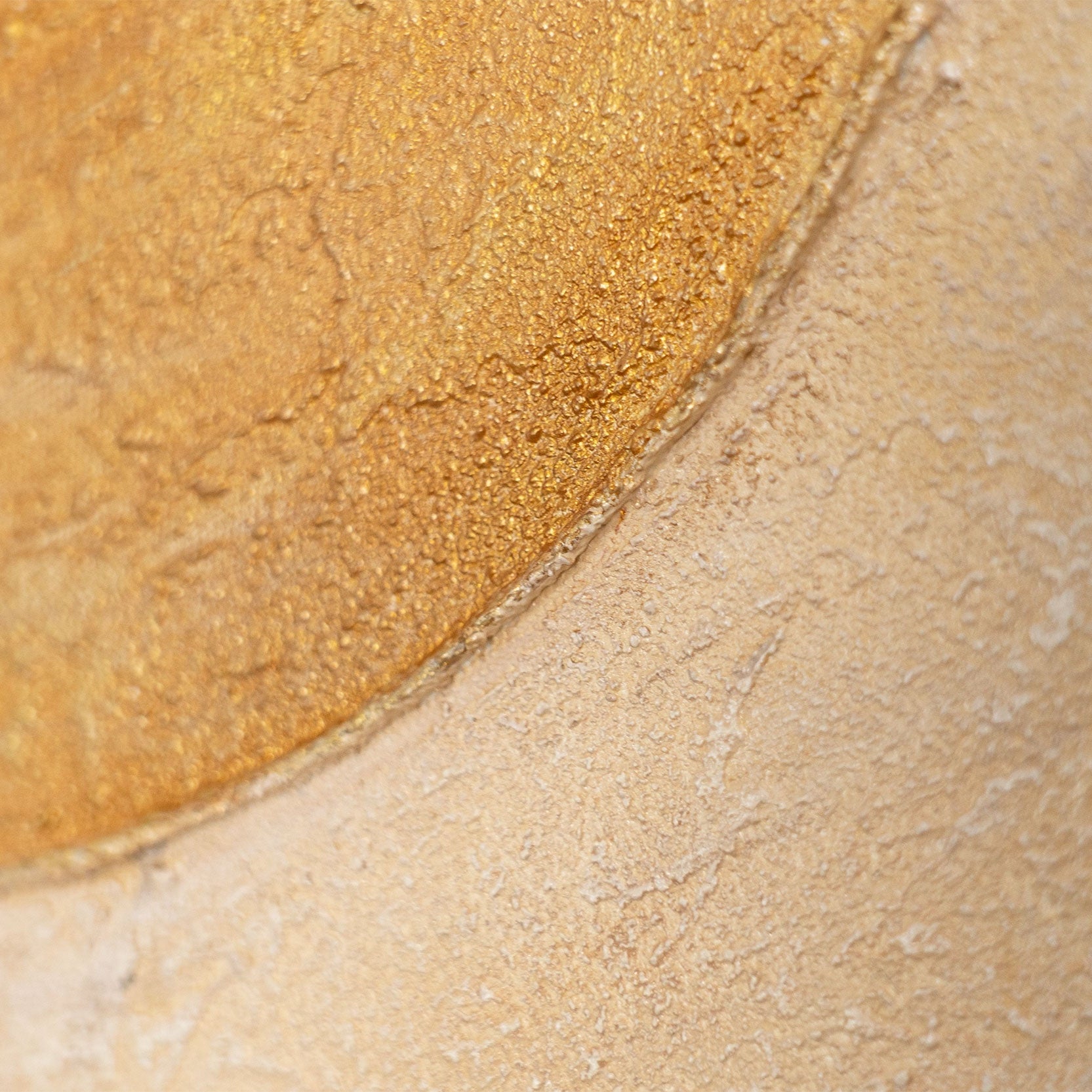 „Form und Textur“ ist ein Spiel der Kontraste, bei dem sich strenge Geometrie mit lebendiger Materialität der Oberfläche verbindet. Ein schwarzes Halbkreis, goldene Flächen und warme beige-sandfarbene Texturen schaffen eine Harmonie zwischen Stabilität und Bewegung. Das Bild verkörpert das Gefühl eines natürlichen Rhythmus und Gleichgewichts, das der modernen Abstraktion eigen ist.