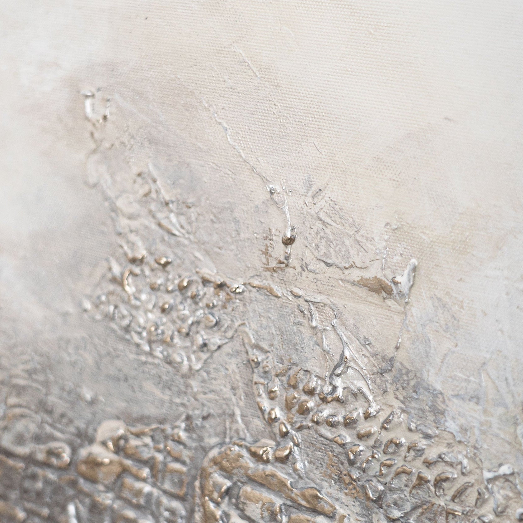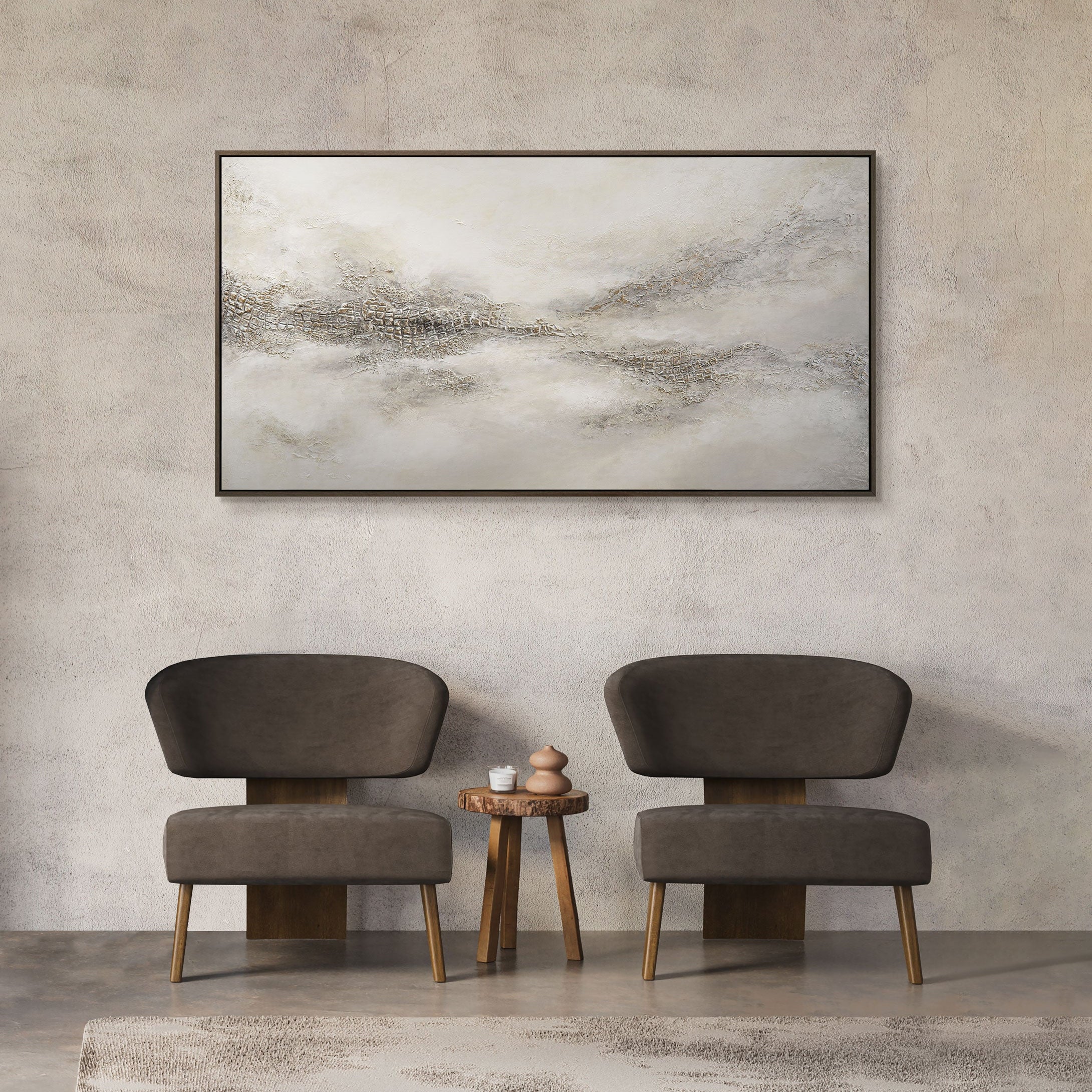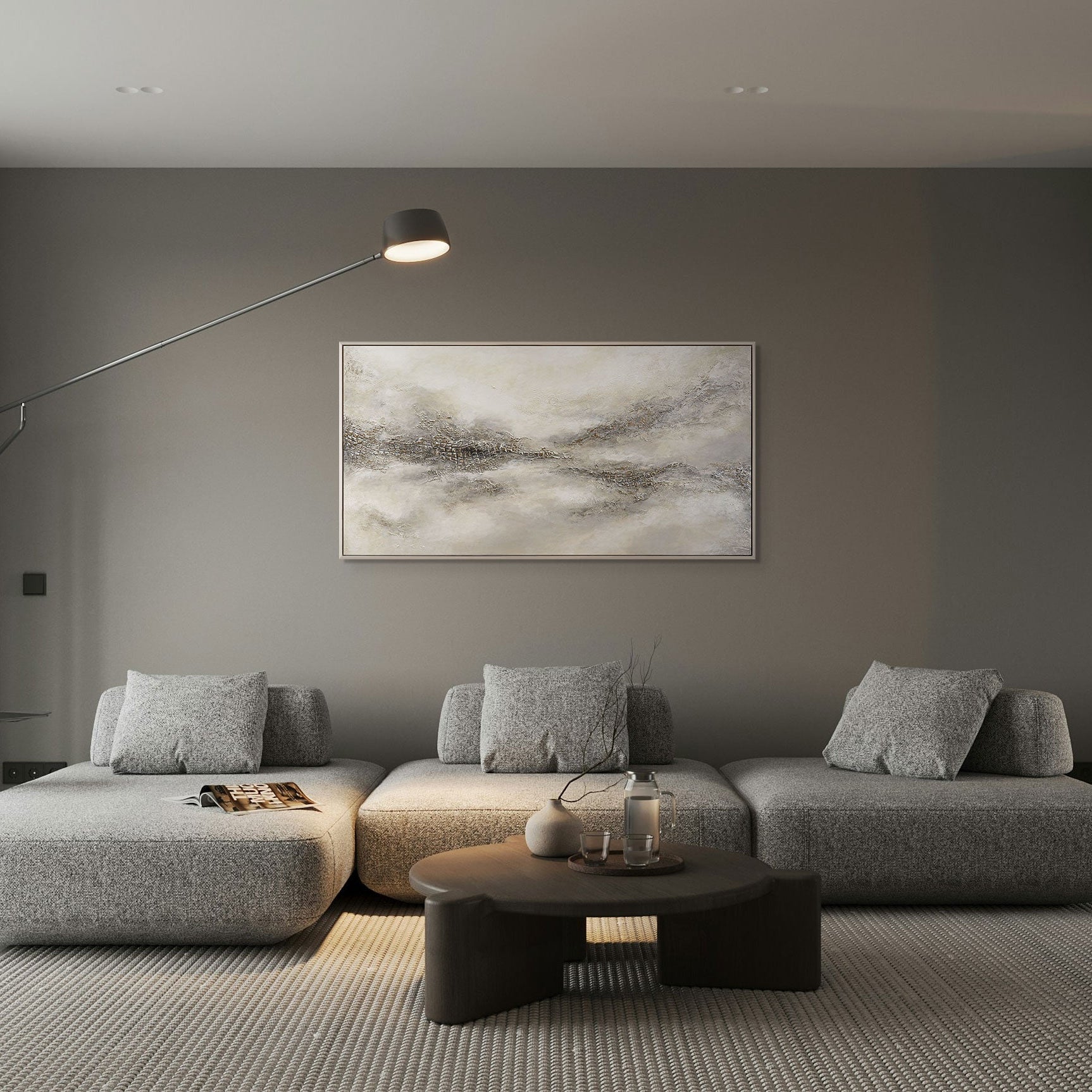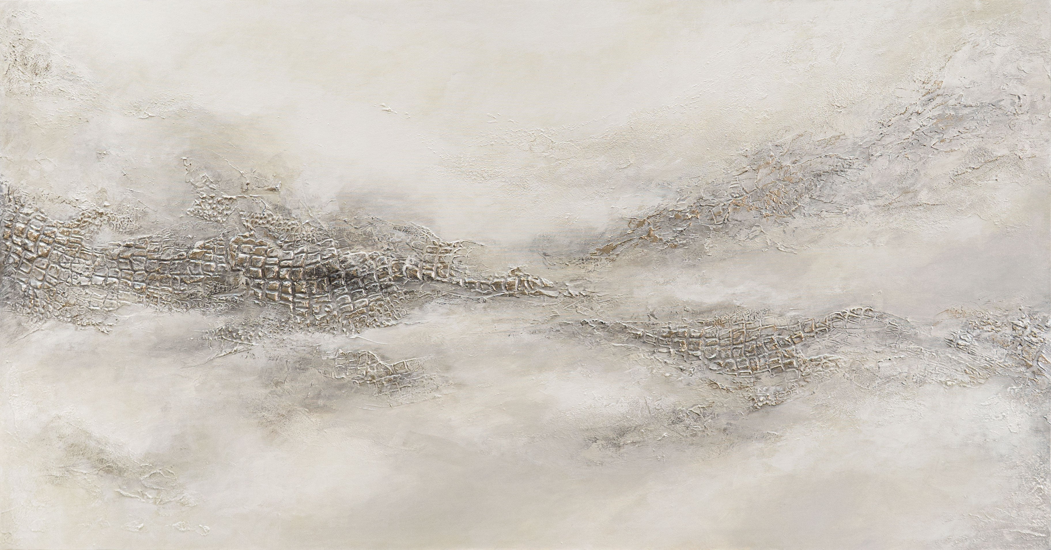 „Nebelige Ferne“ ist eine raffinierte Kombination aus Licht und Textur, in der sanfte Grau-, Beige- und Perlmutttöne fließend ineinander übergehen. Die strukturierte Oberfläche erinnert an eine ruhige Landschaft, die im Morgennebel verschwindet und eine Atmosphäre der Unendlichkeit und Harmonie schafft.