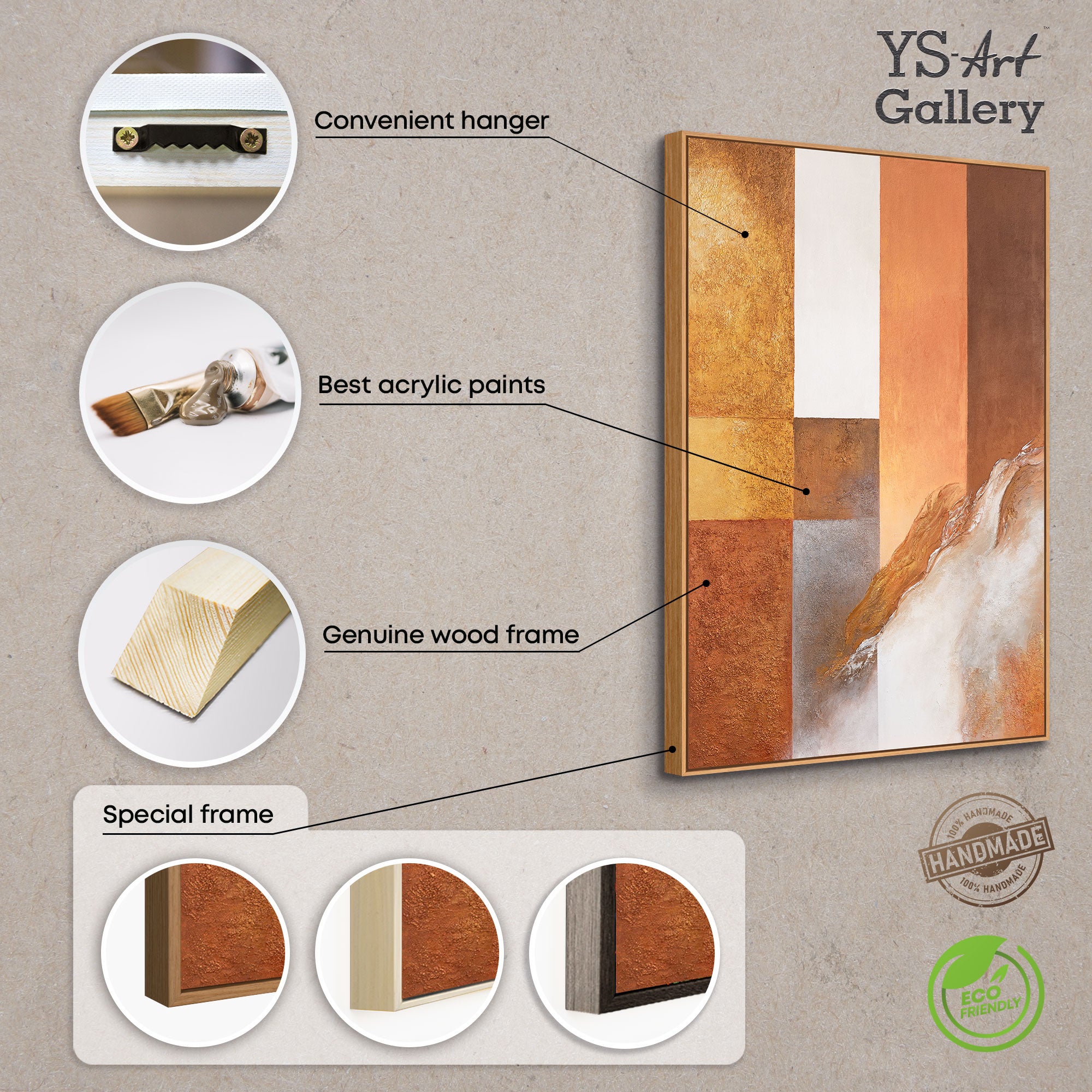 „Harmonie der Formen“ ist eine abstrakte Komposition, in der warme Ocker-, Terrakotta- und Brauntöne mit weißen und grauen Akzenten kombiniert werden. Der Kontrast zwischen rechteckigen Blöcken und fließenden Linien schafft ein Gleichgewicht zwischen strenger Form und lebendiger Dynamik. Die strukturierte Oberfläche verleiht Tiefe, während die Farbverläufe ein Gefühl von Bewegung und Wärme erzeugen.