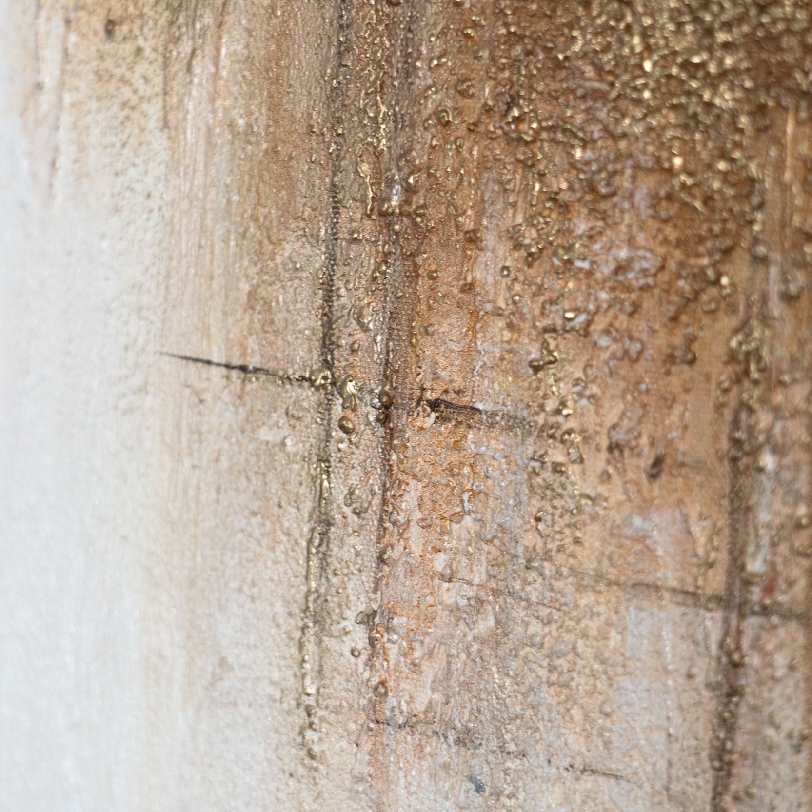 „Honignebel“ ist eine abstrakte Komposition, in der warme gold-honigfarbene Töne sanft in helle Weiß- und Beigetöne übergehen. Leichte, halbtransparente Schichten erzeugen den Eindruck von Nebel, durch den Lichtstrahlen hindurchscheinen. Die strukturierte Oberfläche verstärkt die Farbtiefe und verleiht dem Bild eine ausdrucksstarke Eleganz.
