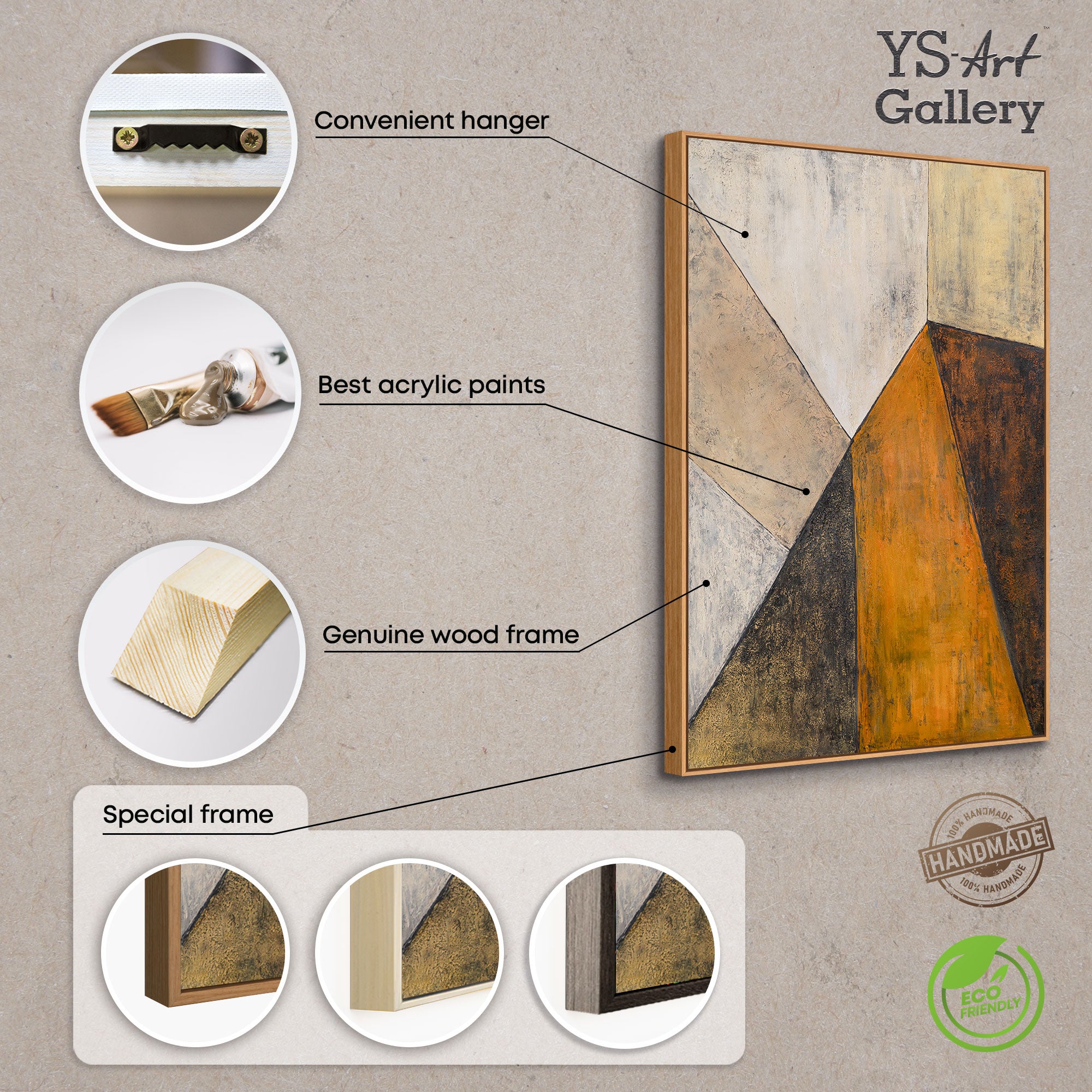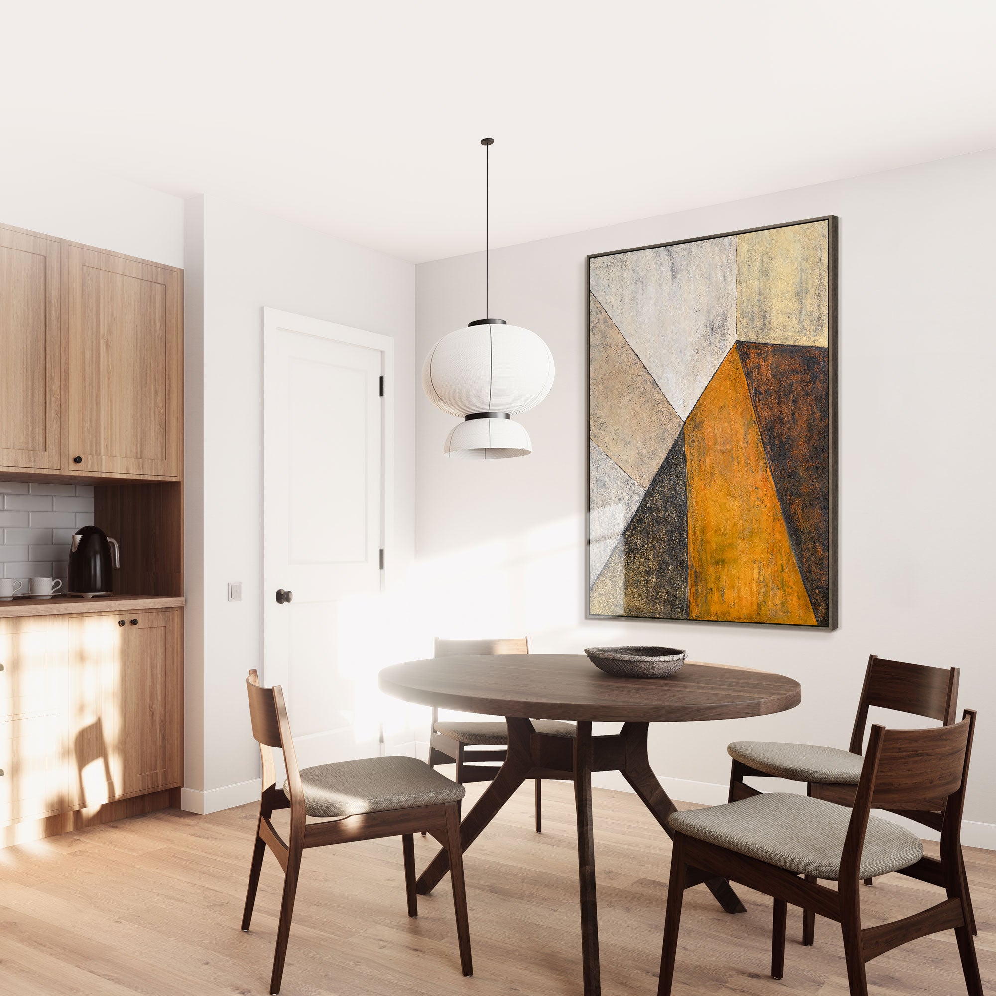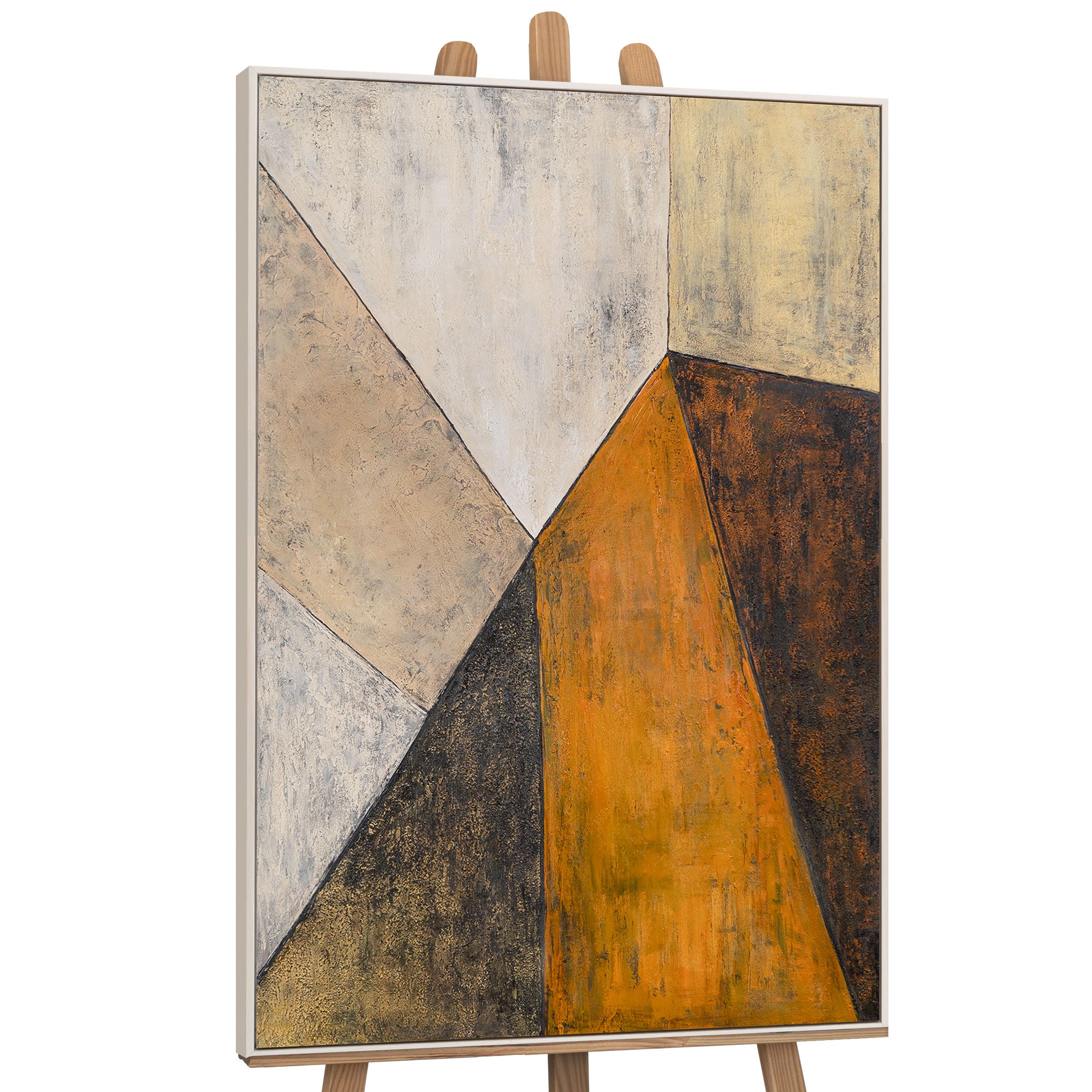 „Begegnung der Ebenen“ ist ein Dialog zwischen Farben und Formen, in dem sanfte beige, schwarze und satte orangefarbene Ebenen sich überschneiden und ein Gefühl architektonischer Tiefe erzeugen. Die strukturierte Oberfläche verleiht dem Werk Materialität, während der Kontrast zwischen Licht und Schatten eine dynamische Komposition bildet, die den Blick auf sich zieht.