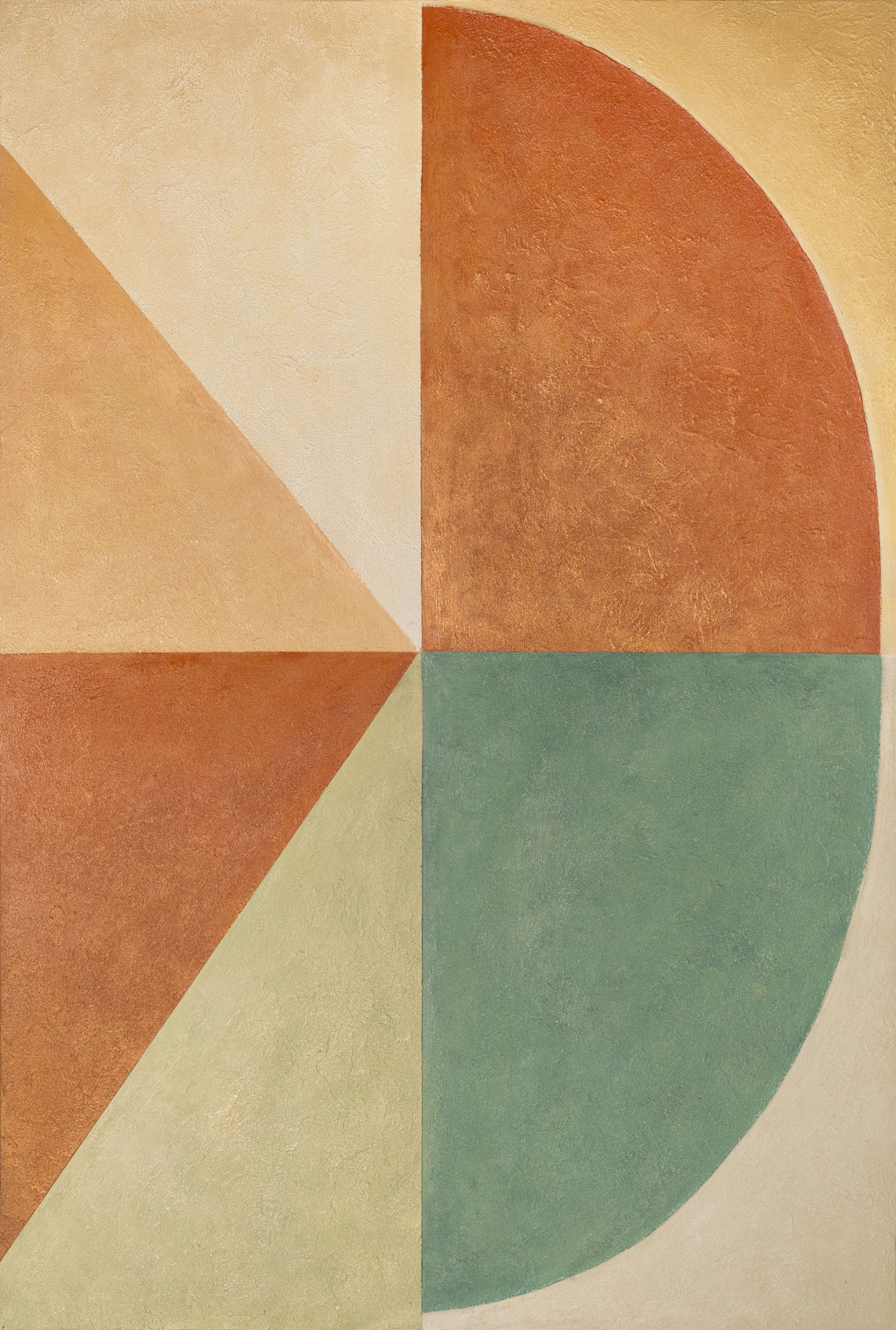 „Formen im Gleichgewicht“ ist eine geometrische Komposition, in der ruhige, warme Farben mit weichen Linien und klarer Symmetrie kombiniert werden. Die Kombination aus Orange-, Grün- und Beigetönen schafft einen harmonischen Kontrast, der die Idee von Gleichgewicht und natürlicher Bewegung vermittelt. Das Bild strahlt ein Gefühl von Stabilität und innerer Ruhe aus.