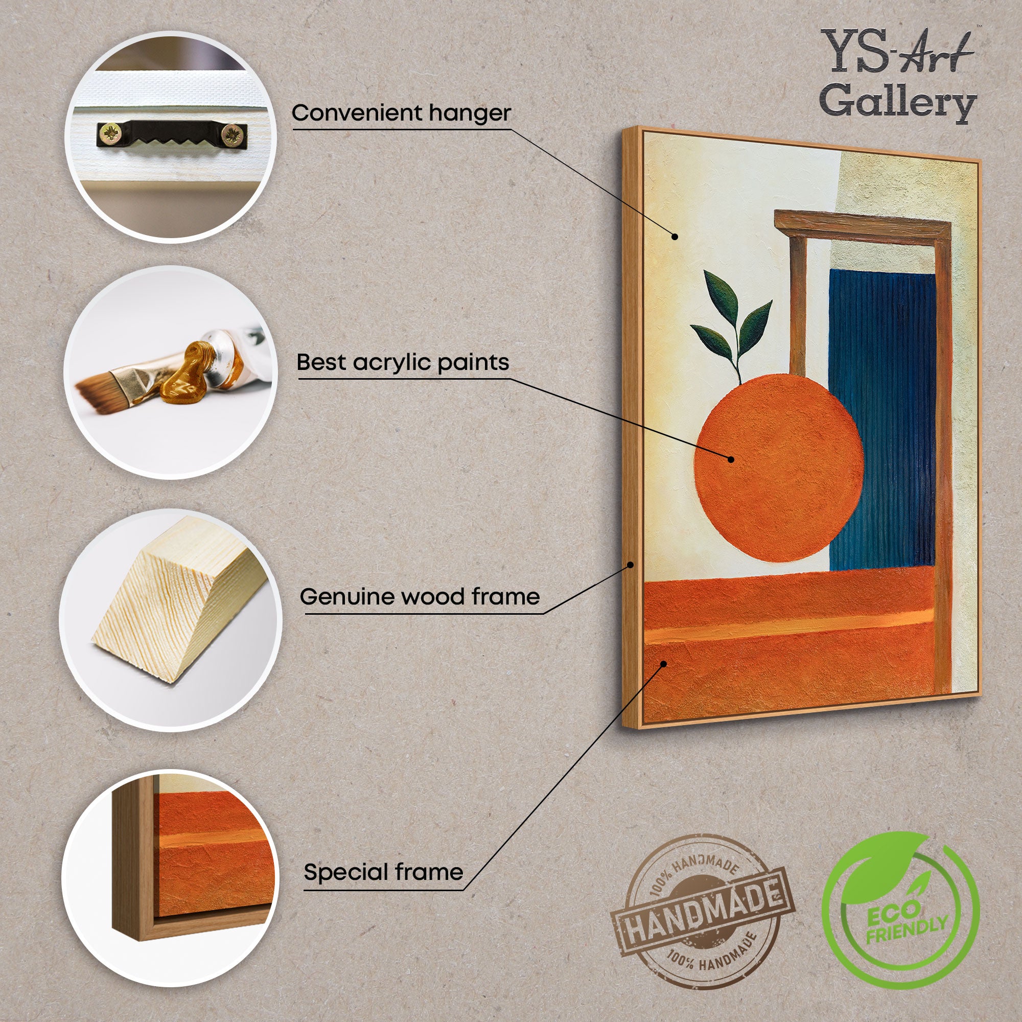 „Fruchtbalance“ ist eine künstlerische Metapher für Harmonie und Frische. Geometrische Formen werden mit natürlichen Motiven kombiniert, und die satte orange Farbe vermittelt ein Gefühl von Wärme und Energie. Der Kontrast zum tiefblauen Hintergrund verleiht dem Bild Tiefe, während das grüne Blatt einen natürlichen Akzent setzt.