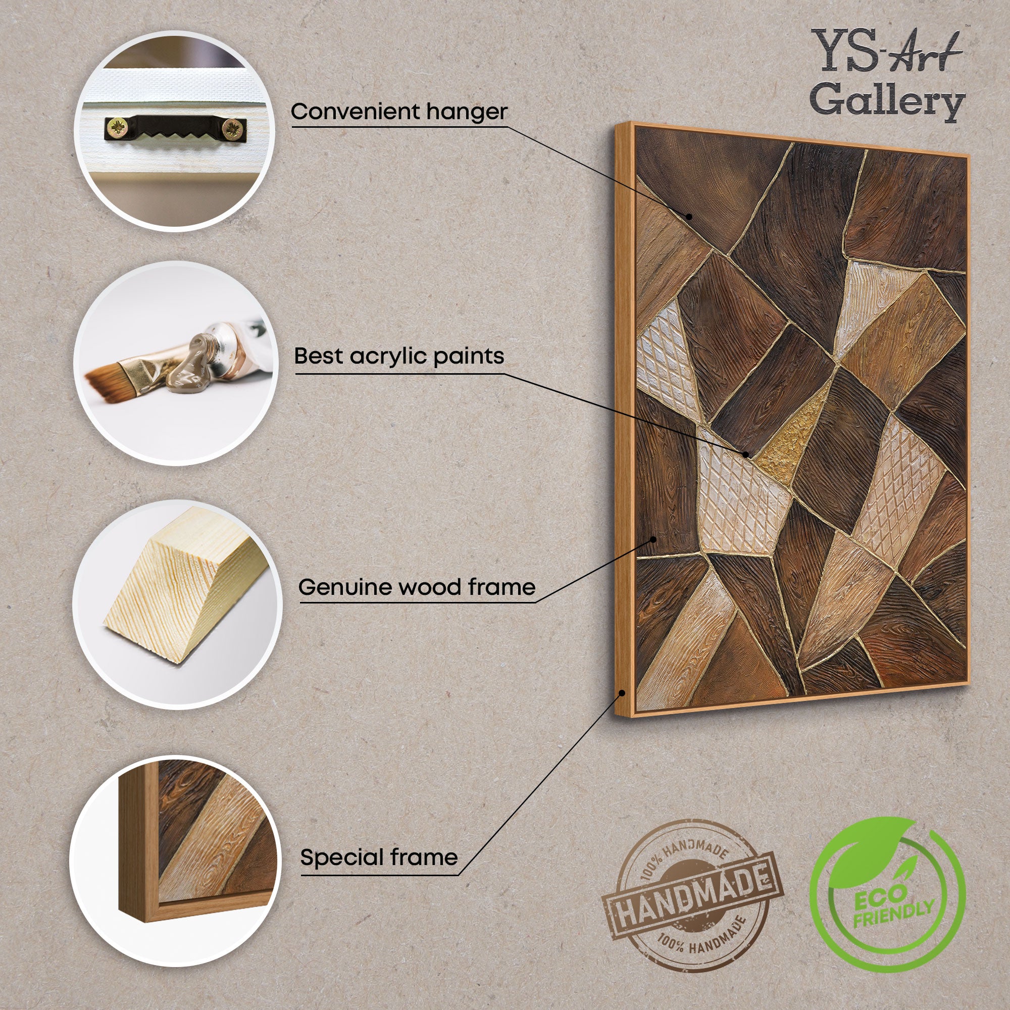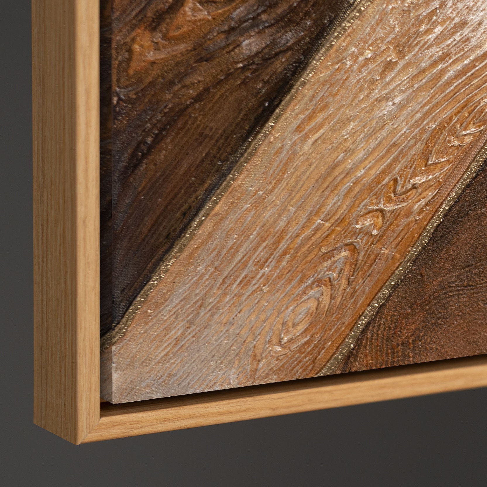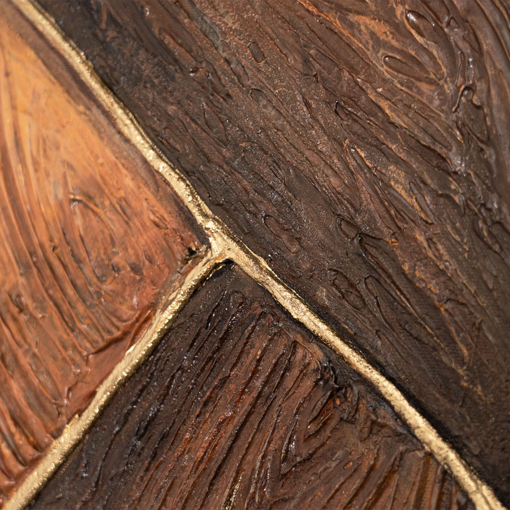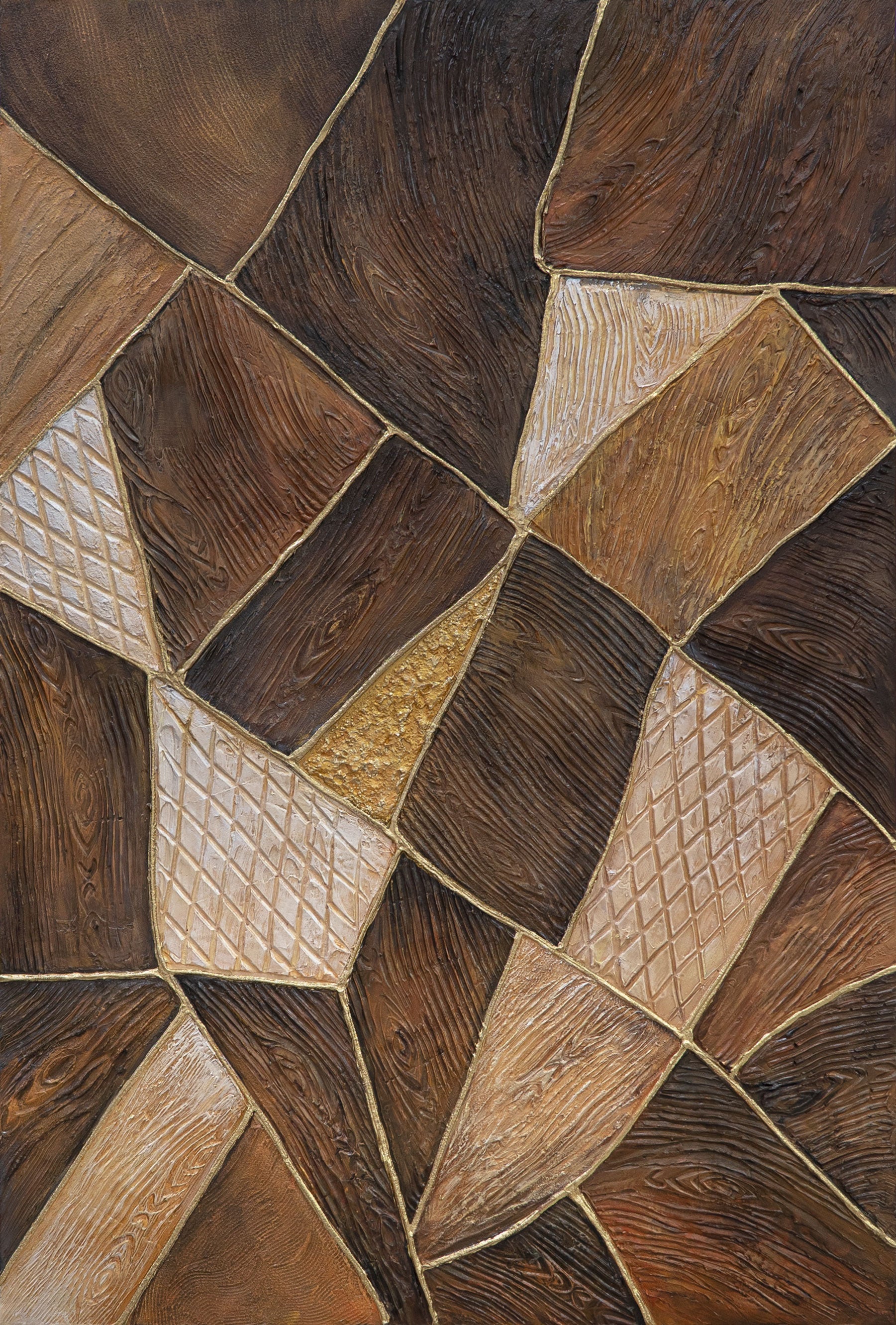 „Geometrie des Goldes“ ist eine Kombination aus natürlicher Holzstruktur, tiefen Brauntönen und edlem Goldglanz. Das Bild wurde in einer ausdrucksstarken Relieftechnik geschaffen, bei der jedes Segment eine eigene strukturierte Fläche bildet. Warme Töne und eine komplexe Oberflächenstruktur verleihen dem Gemälde den Effekt eines natürlichen Materials – wie Fragmente der Erde, die zu einem harmonischen Muster verbunden sind.
