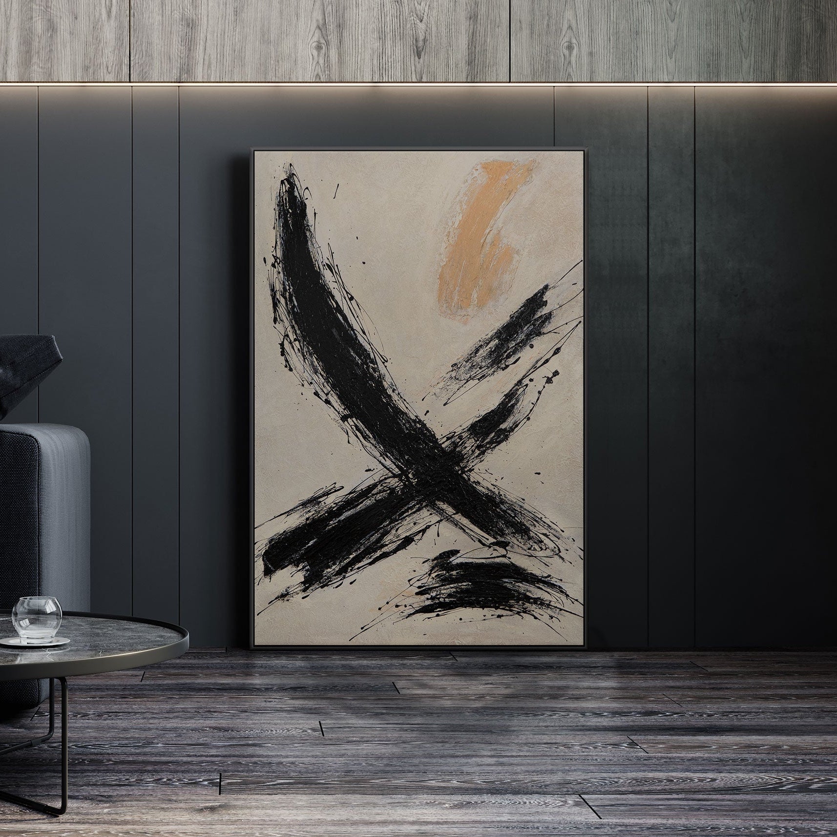 „Die Kraft des Pinselstrichs“ ist eine Explosion von Emotionen, festgehalten in schwarzem Acryl. Dynamische, scharfe Pinselbewegungen erzeugen ein Gefühl von Energie, die nach außen drängt. Die strukturierte Oberfläche und der beige Hintergrund verleihen Tiefe und lassen jeden Pinselstrich in seinem eigenen Rhythmus leben. In dieser Abstraktion gibt es keinen Zufall – nur Ausdruck, Aktion und das Gefühl von Kraft.
