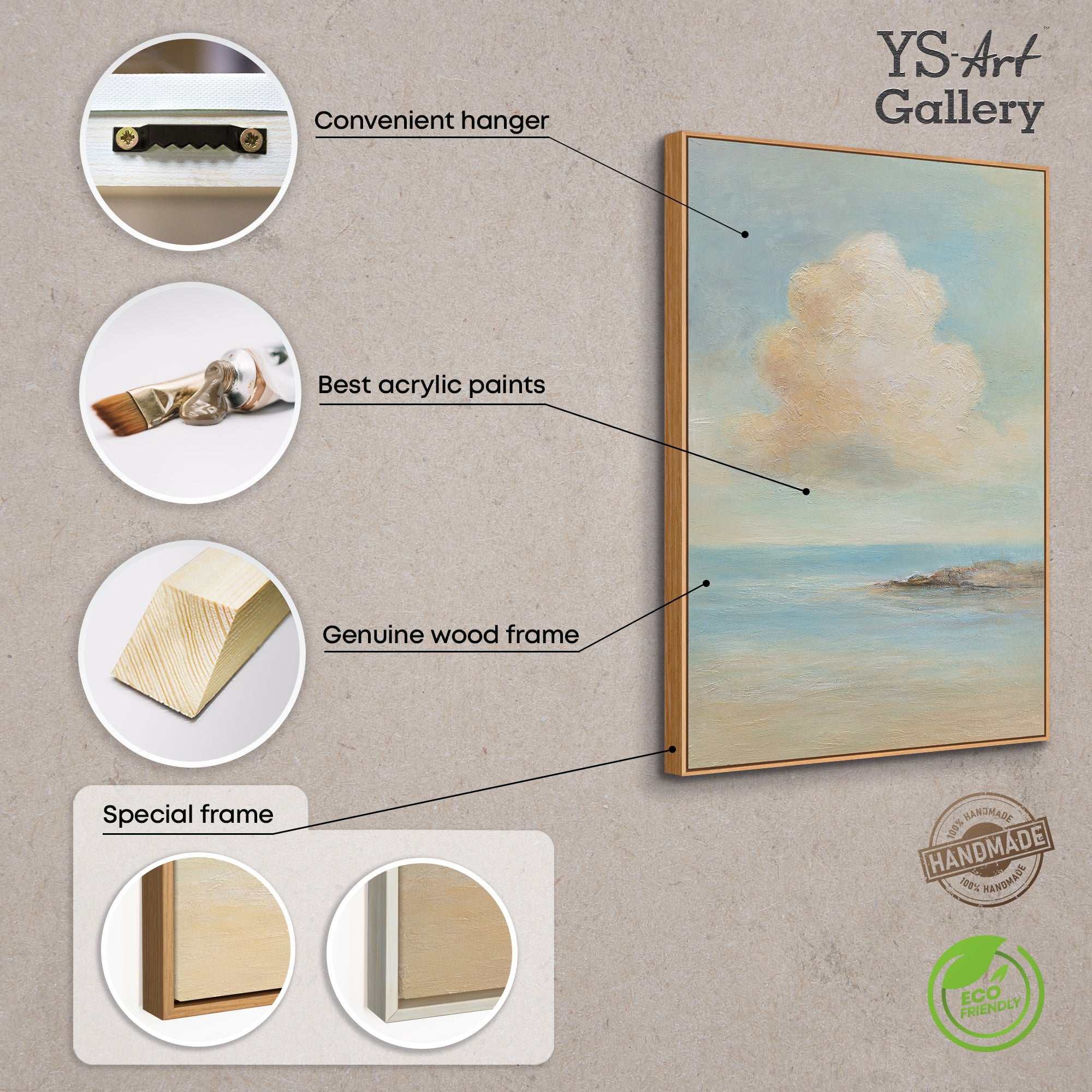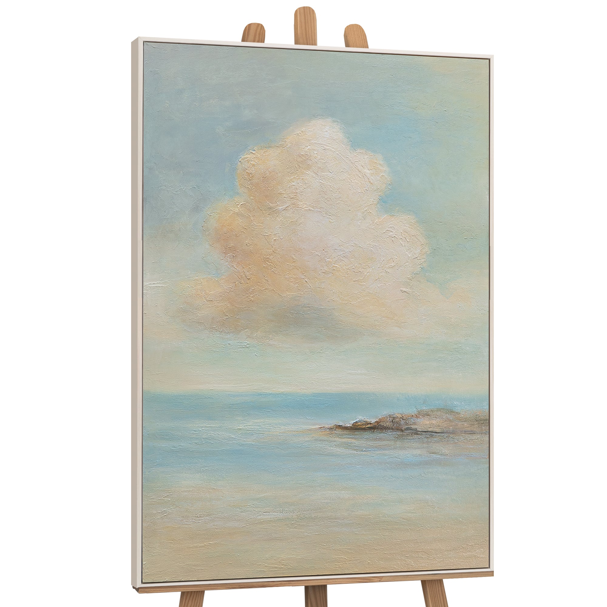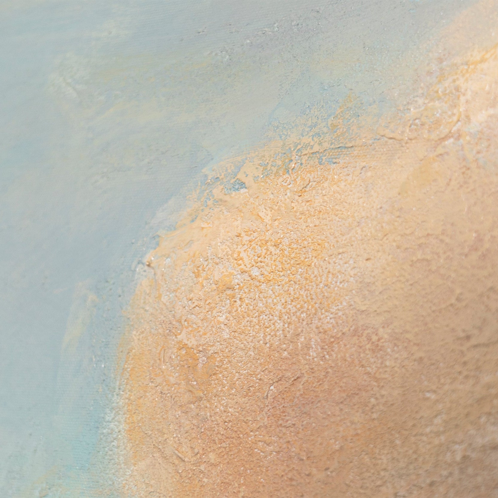 „Die Leichtigkeit des Seins“ ist ein Gemälde über die Ruhe, die in der Stille des Meeres entsteht. Sanfte Blau- und Sandtöne verschmelzen am unendlichen Horizont, wo eine einsame Wolke über dem ruhigen Wasser schwebt. Die Textur der Pinselstriche verleiht dem Bild Tiefe und schafft ein Gefühl von lebendiger Bewegung von Licht und Luft.