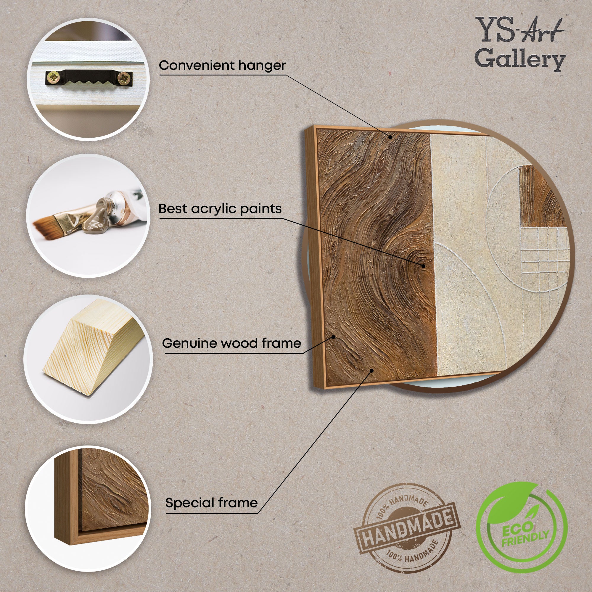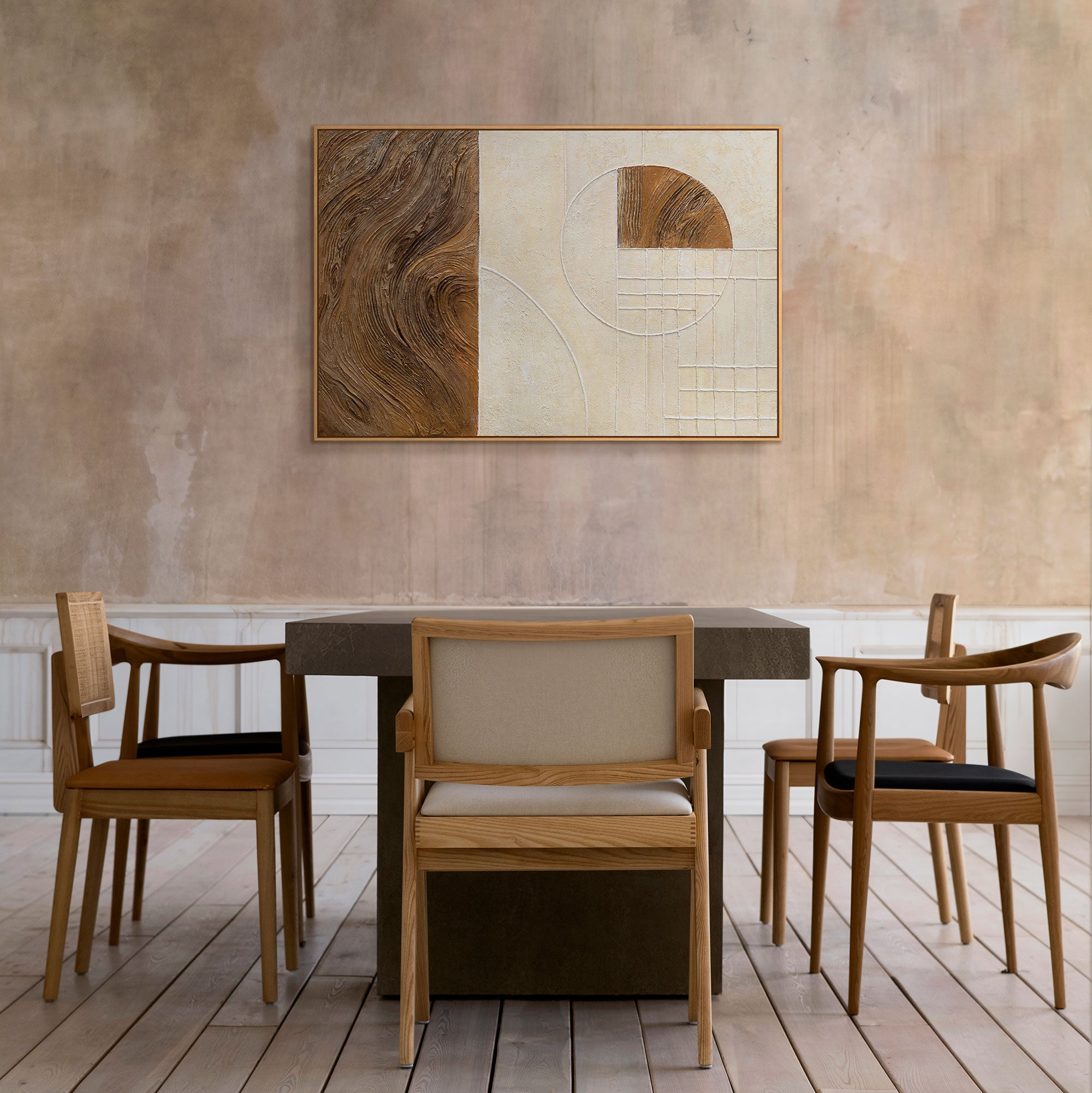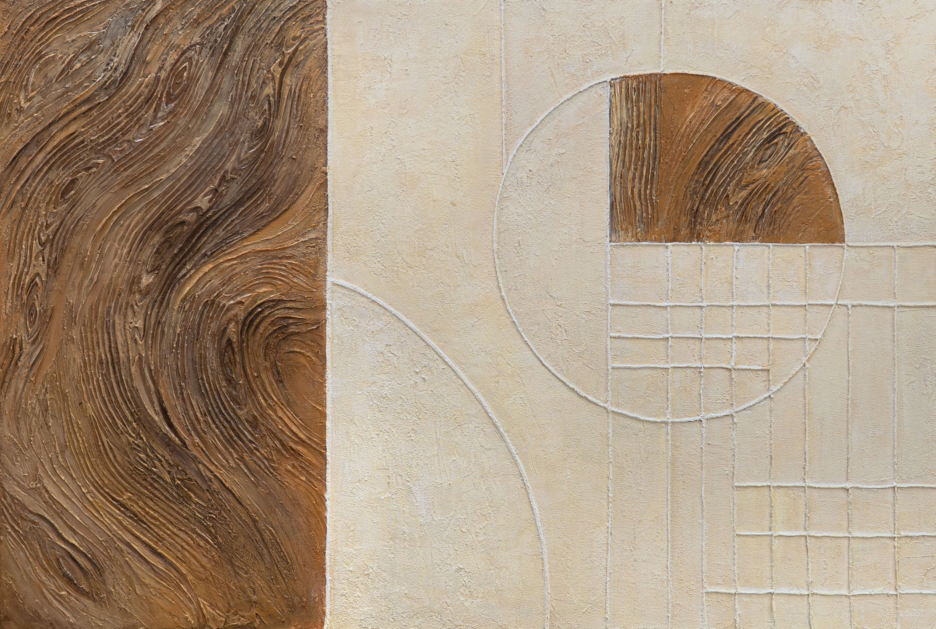 „Linien und Kreise“ ist eine Kombination aus der natürlichen Textur des Holzes und der architektonischen Klarheit der Form. Das Bild vereint zwei Elemente – Natürlichkeit und Ordnung. Der linke Teil der Leinwand vermittelt die Bewegung und Wärme der Holzmaserung, während der rechte Teil durch geometrische Strukturen und minimalistische Farben für Ausgewogenheit sorgt.