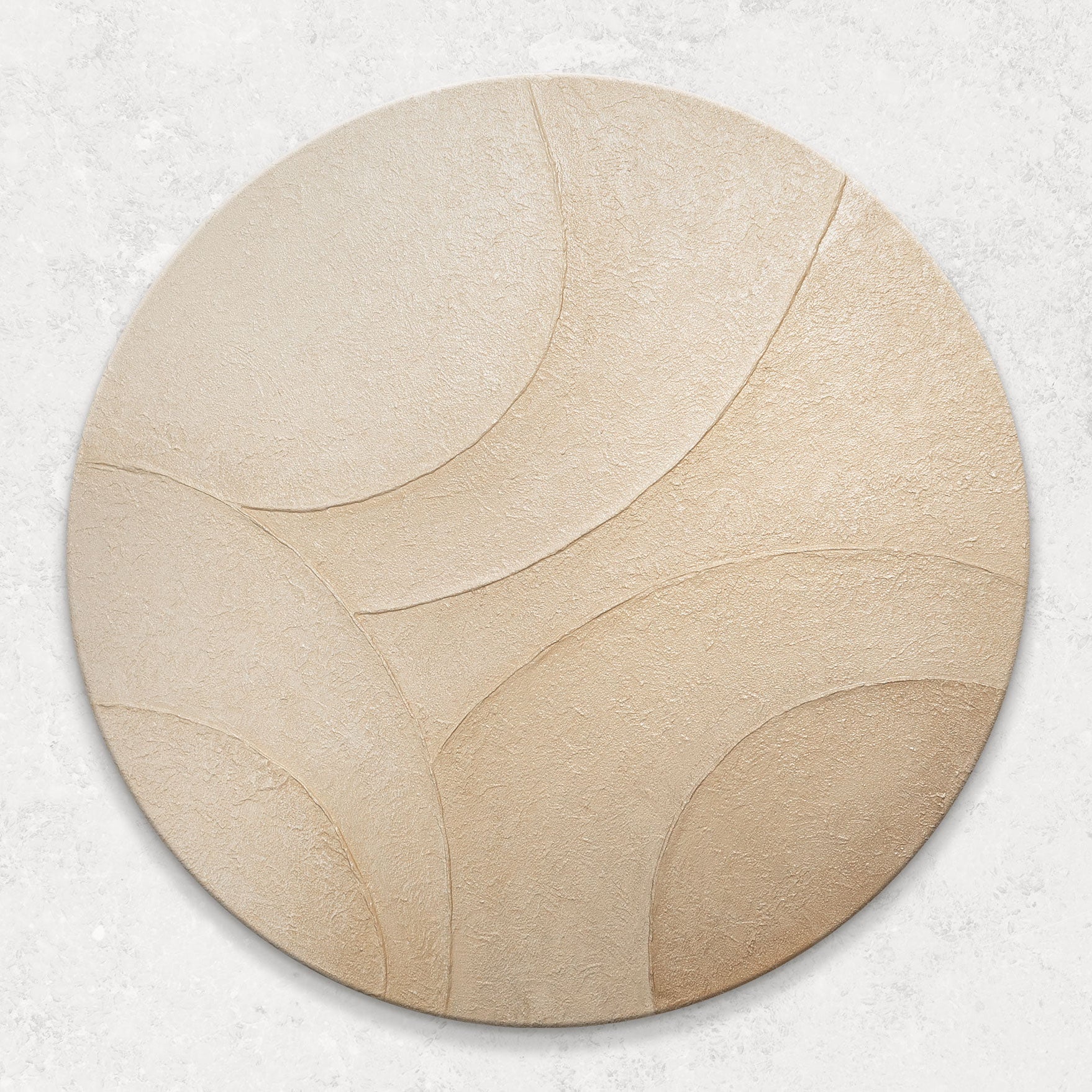 „Ornament des Windes“ ist eine abstrakte runde Komposition, in der fließende Linien einen natürlichen Bewegungsrhythmus bilden. Sanfte Beige- und Sandtöne vermitteln ein Gefühl von Leichtigkeit, als würde die Oberfläche von einem sanften Windhauch gestreift. Das Spiel des Lichts auf der Textur verstärkt das Volumen und schafft ein Gefühl von raffinierter Plastizität.
