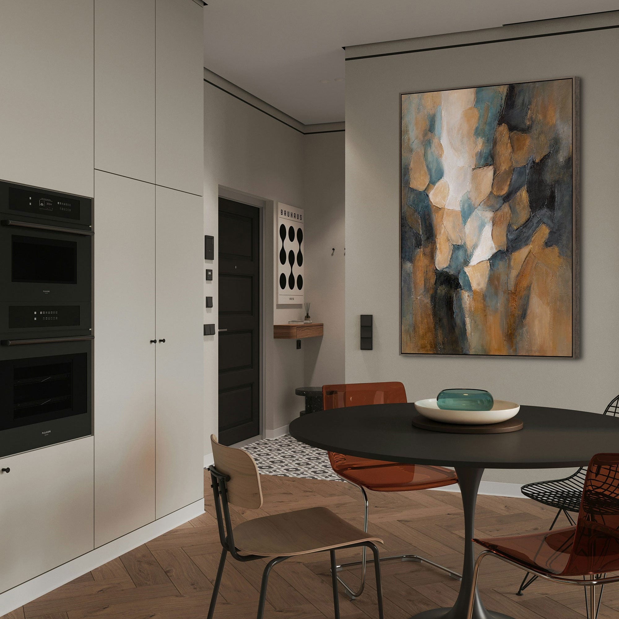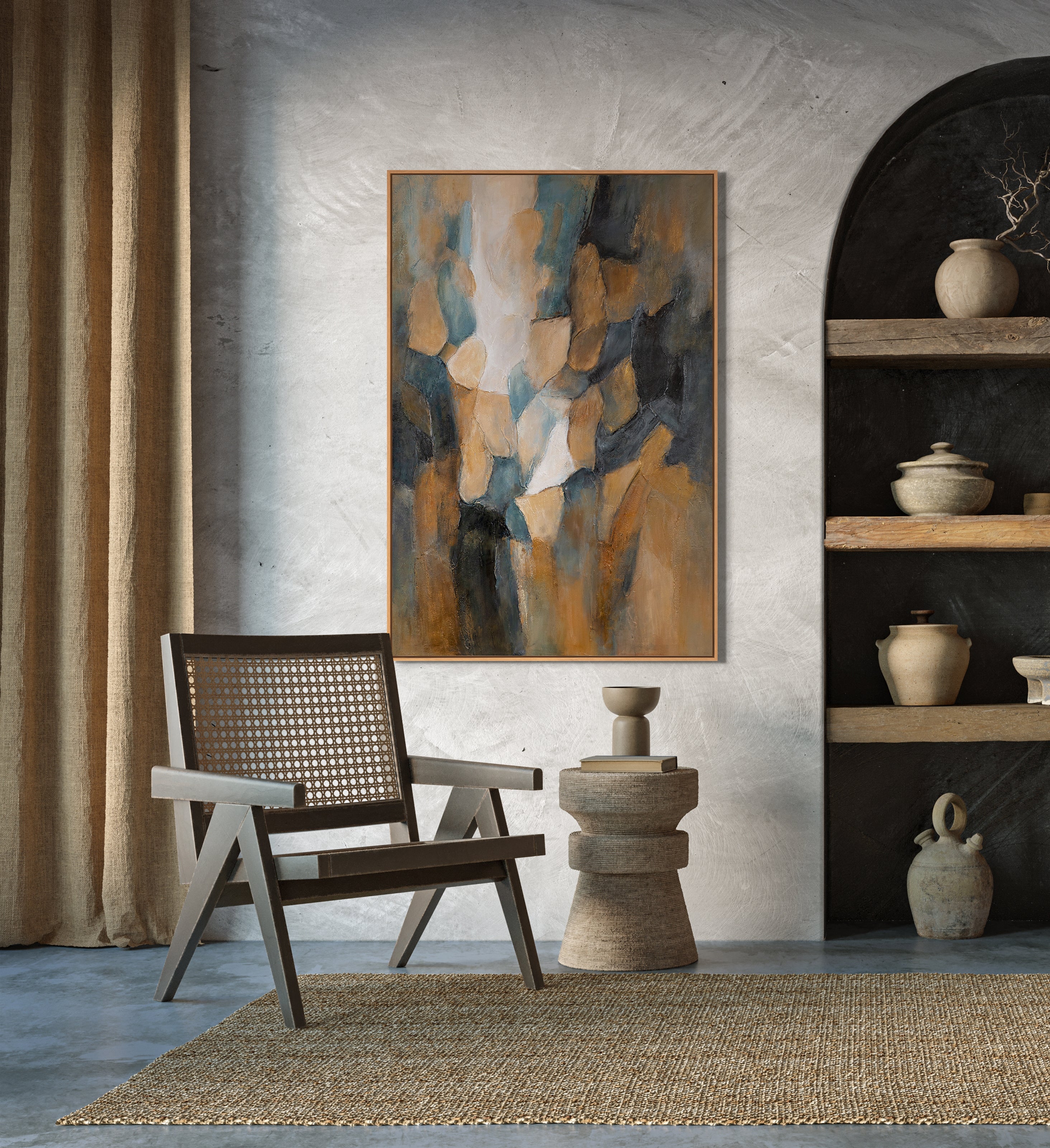 „Palette des Abends“ fängt den Moment ein, in dem das Tageslicht den warmen Farbtönen des Sonnenuntergangs weicht. Die sanften Übergänge von Ocker-, Grau-Blau- und Terrakottafarben vermitteln ein Gefühl der Ruhe, als wäre die Luft mit der Wärme des Abends erfüllt. Die reliefartige Oberfläche verleiht dem Gemälde Tiefe und Dynamik und betont das Spiel des Lichts auf der Textur der Pinselstriche.