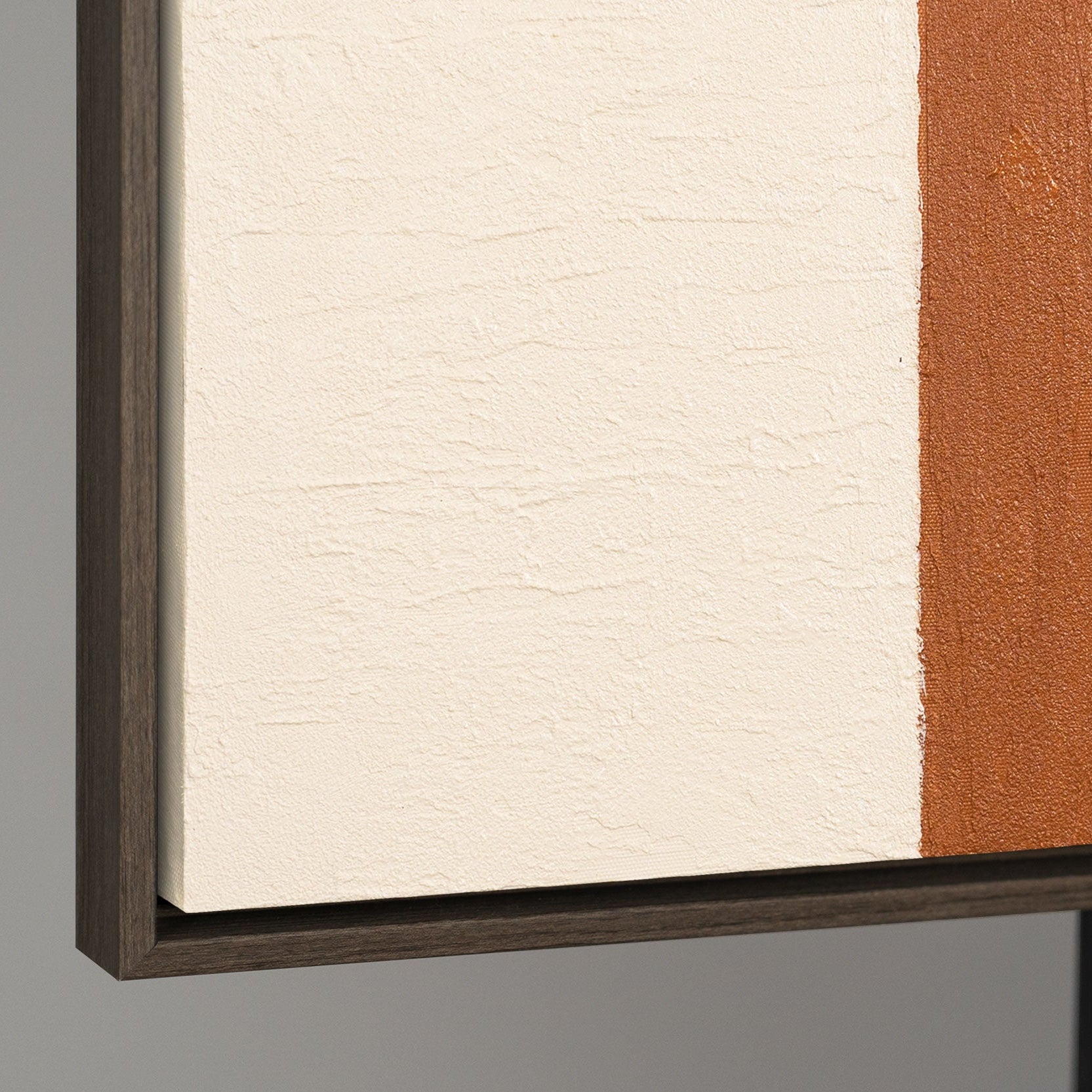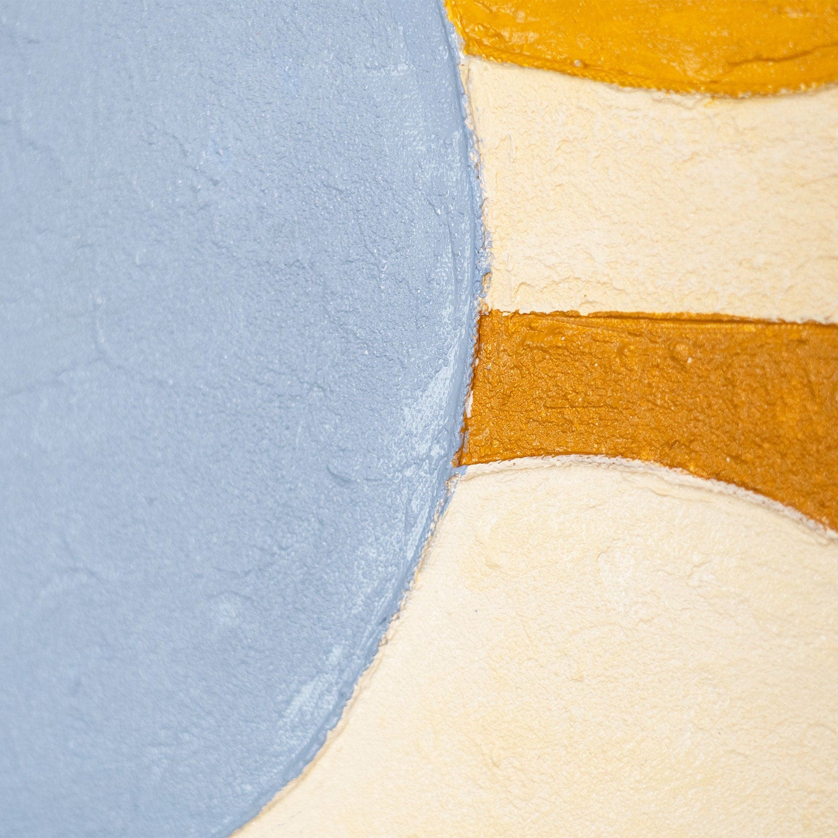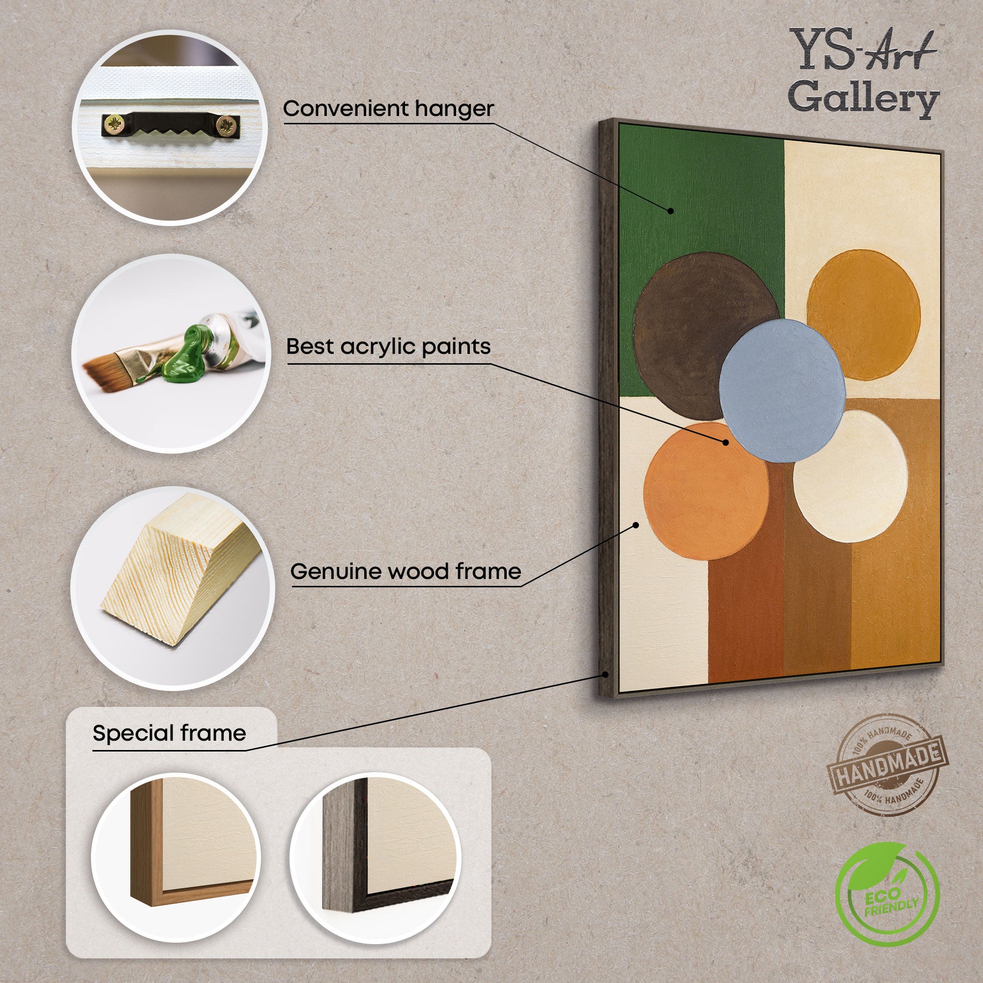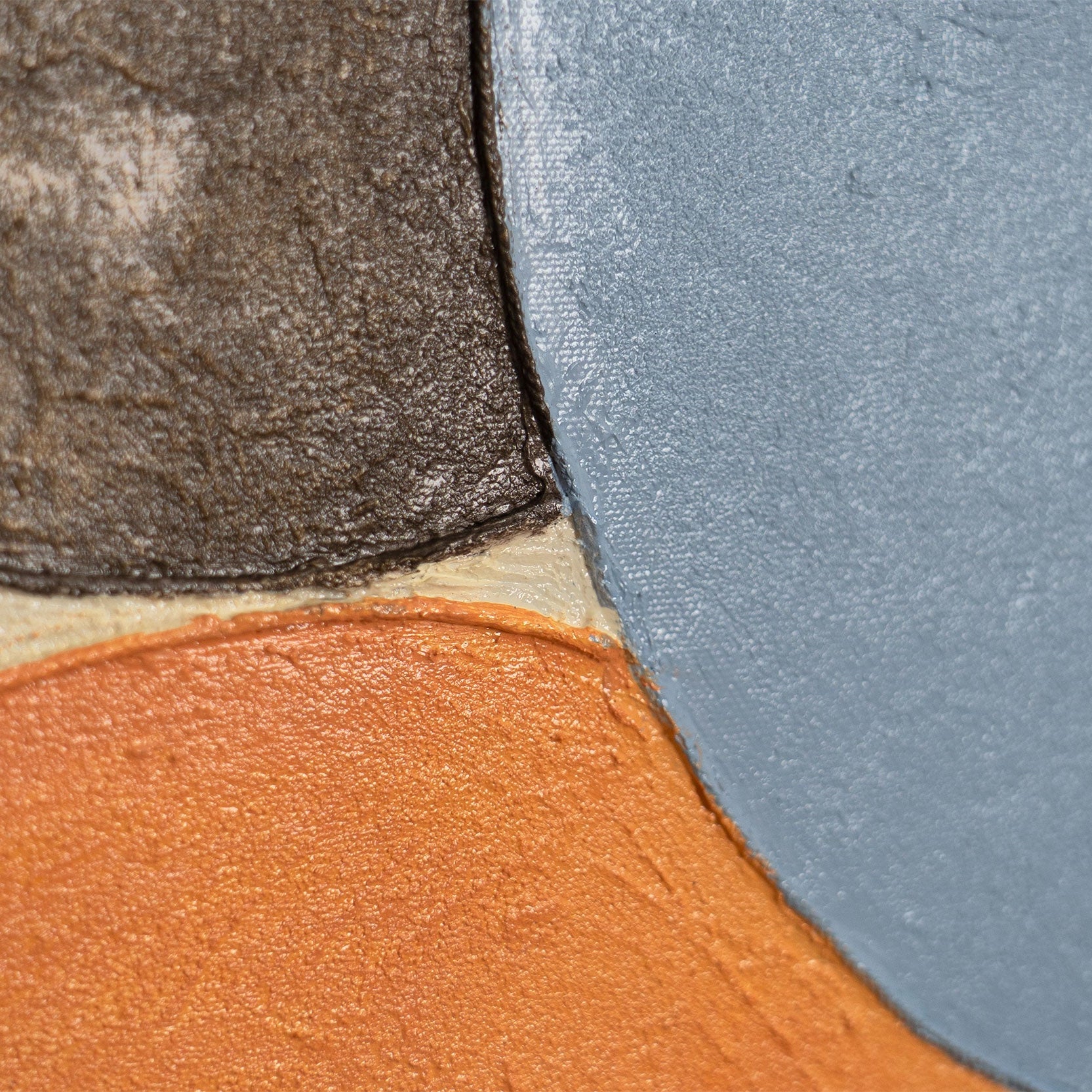 „Sphäre des Gleichgewichts“ ist eine geometrische Abstraktion, in der die Kombination aus Kreisen und Quadraten ein Gefühl von Harmonie und Symmetrie vermittelt. Warme Terrakotta-, Gelb- und Ockertöne werden durch ruhiges Blau und Grün ausgeglichen und bilden eine ausgewogene Komposition, die die Einheit der Elemente und Ruhe symbolisiert.