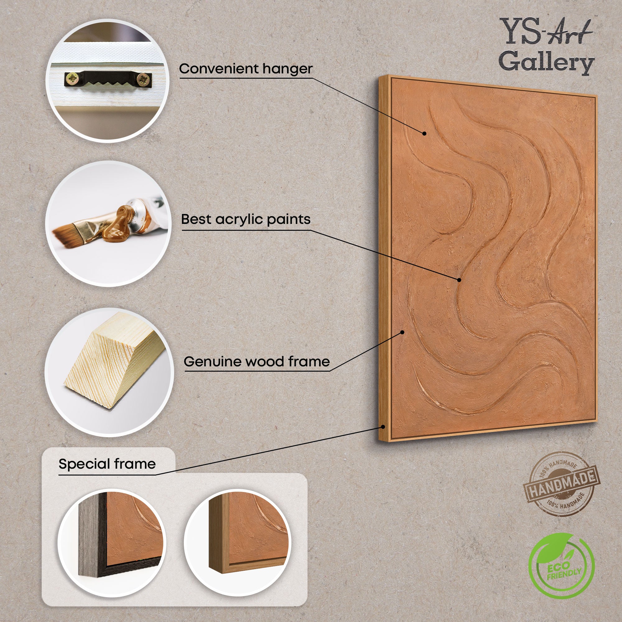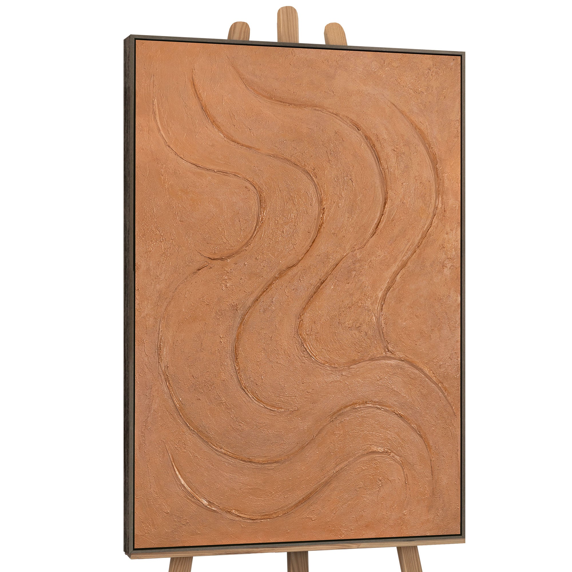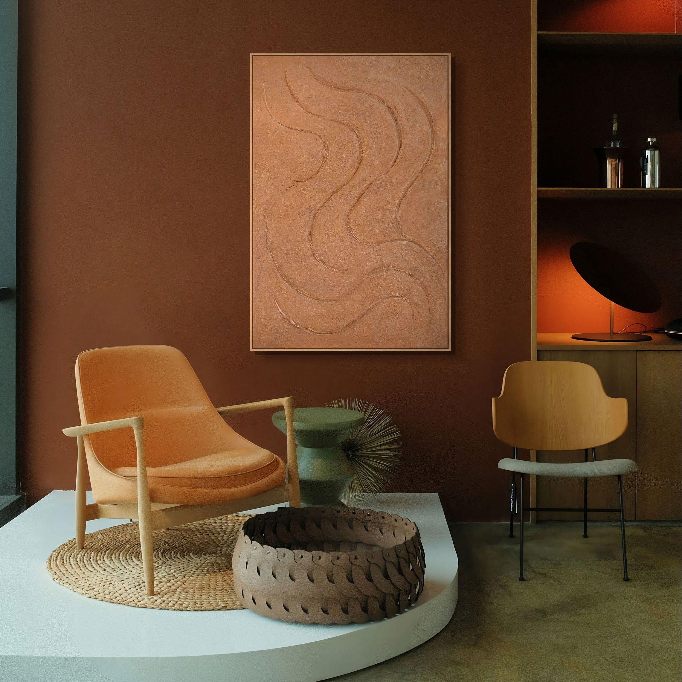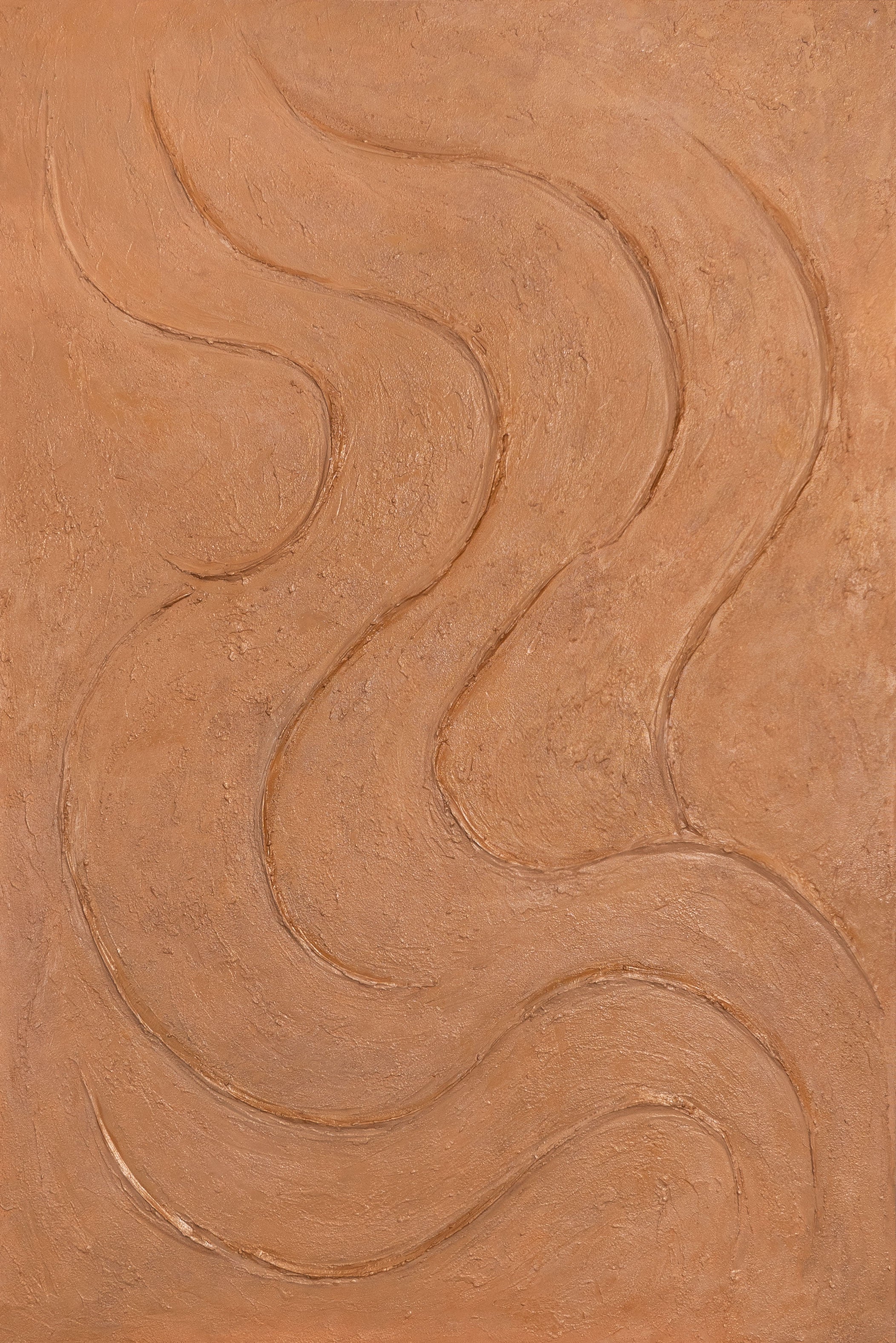 „Warme Rhythmen“ ist ein abstraktes Gemälde in tiefen Terrakotta-Tönen, die ein Gefühl von Wärme und natürlicher Gemütlichkeit vermitteln. Die fließenden Relieflinien erinnern an Sandwellen oder Windgeräusche, die eine sanfte und harmonische Bewegung bilden. Das Werk vermittelt Ruhe und erfüllt gleichzeitig den Raum mit der Energie natürlicher Schönheit.